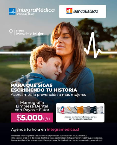 En el contexto del Mes de la Mujer, BancoEstado y Bupa reafirman su compromiso de seguir impulsando el acceso a salud de calidad, acercando la prevención a más mujeres a través de una alianza que permitirá a las mujeres acceder a mamografías en toda su red de prestadores, compuesta por las Clínicas Bupa Antofagasta, Reñaca y Santiago, además de los 33 centros médicos de IntegraMédica, con un copago máximo de $5.000 pagando con tarjetas BancoEstado. Cabe destacar que en IntegraMédica, la red ambulatoria más grande del país, se realizan más de 113.000 mamografías al año.