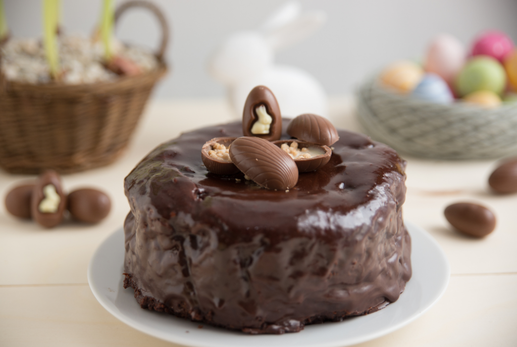 - Baña el queque con la ganache y decora con huevitos de chocolate o confites.