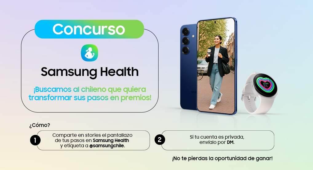 La dinámica es simple: los participantes deberán registrar sus pasos diarios en Samsung Health y luego subir una historia a Instagram etiquetando a Samsung Chile o enviar su registro de pasos a un mensaje directo a la cuenta de Samsung Chile. Quien acumule más pasos durante el período del concurso será premiado con un Galaxy S25 y un Galaxy Watch l-Ultra seguir potenciando su vida wellness.