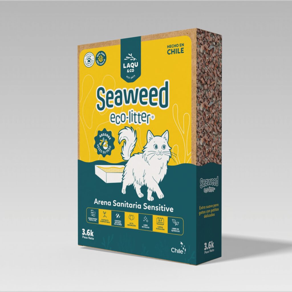 LAQU Eco-Litter® Sensitive: Fórmula desarrollada especialmente para gatos adultos y gatitos con patas más sensibles, gracias a las finas hojas de algas que aportan mayor suavidad. Absorbe más de 7 veces su peso, equivalente a 26 litros