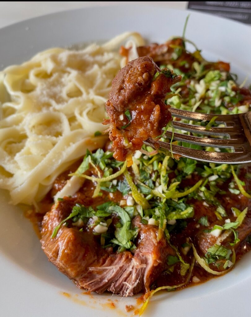 Ossobuco hecho en la salsa pomodoro de La Divina Comida, terminado con gremolata, servido con fettuccine a la mantequilla.