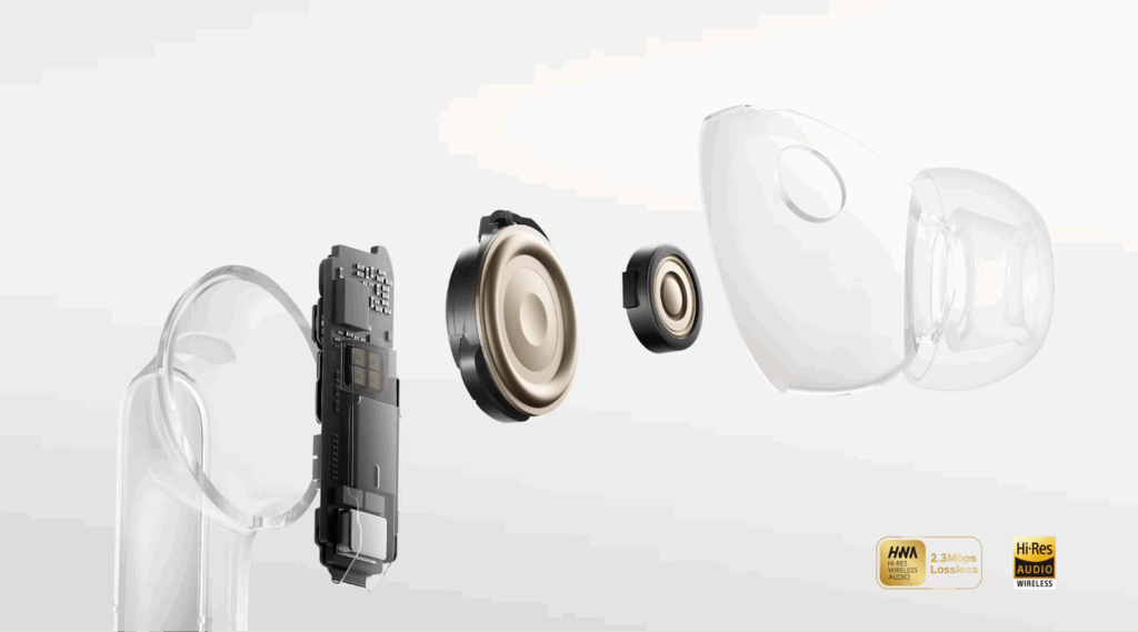 Uno de los principales avances de los HUAWEI FreeBuds Pro 5 es su arquitectura de doble driver, combinada con un modelo de detección MIMO basado en inteligencia artificial. Esta tecnología permite trabajar simultáneamente sobre distintas frecuencias —bajas y altas— logrando una cancelación más completa en comparación con sistemas tradicionales.